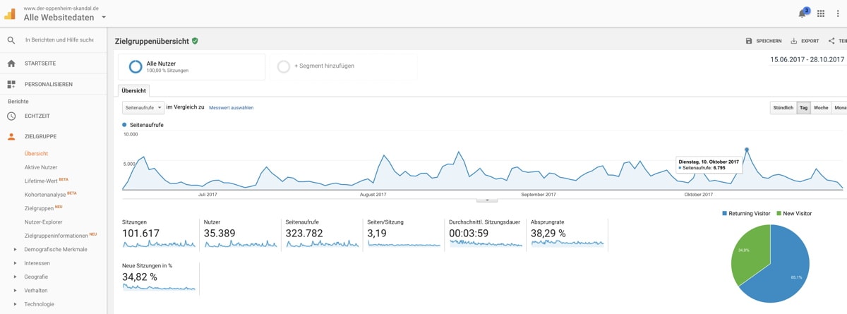 Die Besucher kamen bereits 101.617 Mal auf die Webseite (das Analysetool spricht dann von „Sitzungen“). Jede dieser Sitzungen dauert, auch das wird gemessen, im Schnitt vier Minuten, was für eine Newsseite außergewöhnlich lange ist.