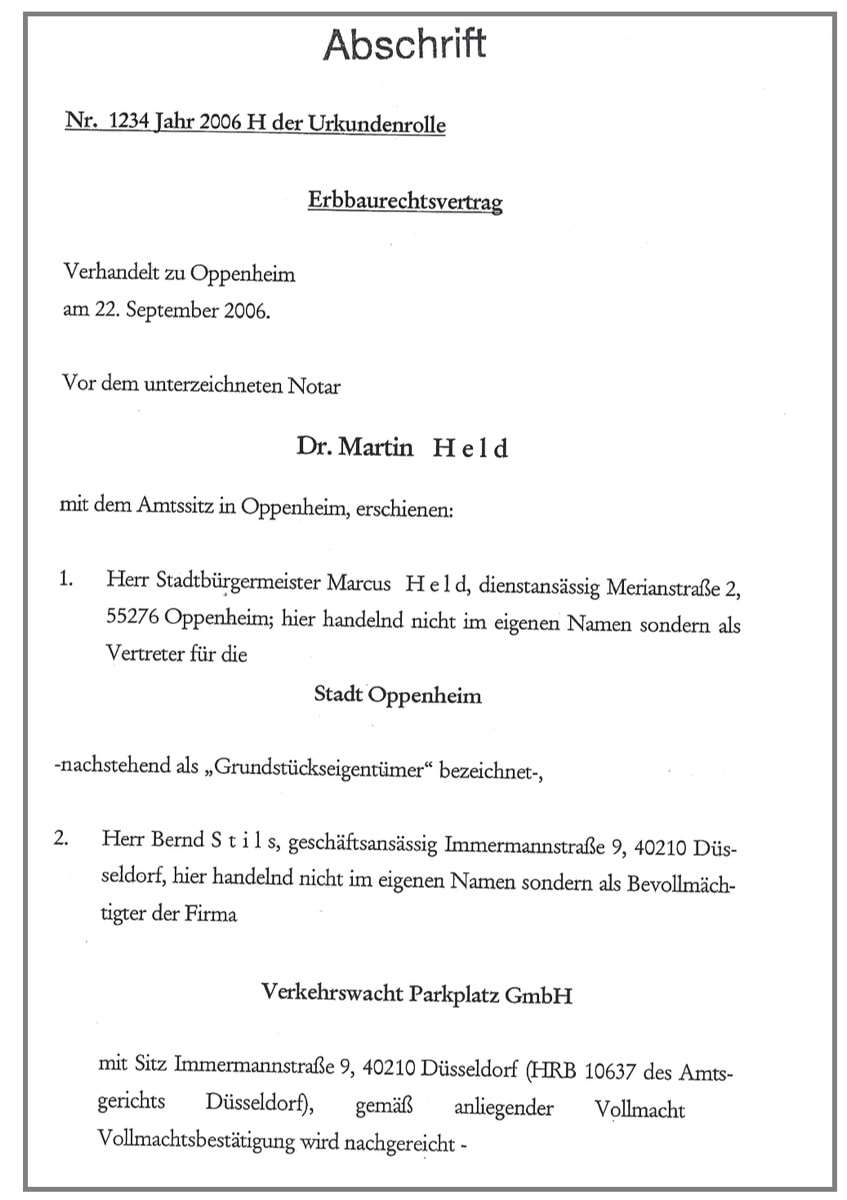 Zwei Verträge wurden am 22. September 2006 von SPD-Stadtbürgermeister Marcus Held und den Herren Bernd Stils und Bernd Beckers als Vertreter der Verkehrswacht Parkplatz GmbH aus Düsseldorf unterzeichnet. Unterm Strich sah der Deal so aus: Das nordrhein-westfälische Unternehmen (nicht zu verwechseln mit dem gemeinnützigen Verein „Deutsche Verkehrswacht“!) bekam von der Stadt ein Grundstück zum Schnäppchenpreis zur Verfügung gestellt und verpflichtete sich, dort einen Parkplatz anzulegen. Im Gegenzug darf darf die Firma seitdem auf vielen Oppenheimer Plätzen und Straßen die Parkgebühren kassieren – insgesamt mindestens 35 Jahre lang.