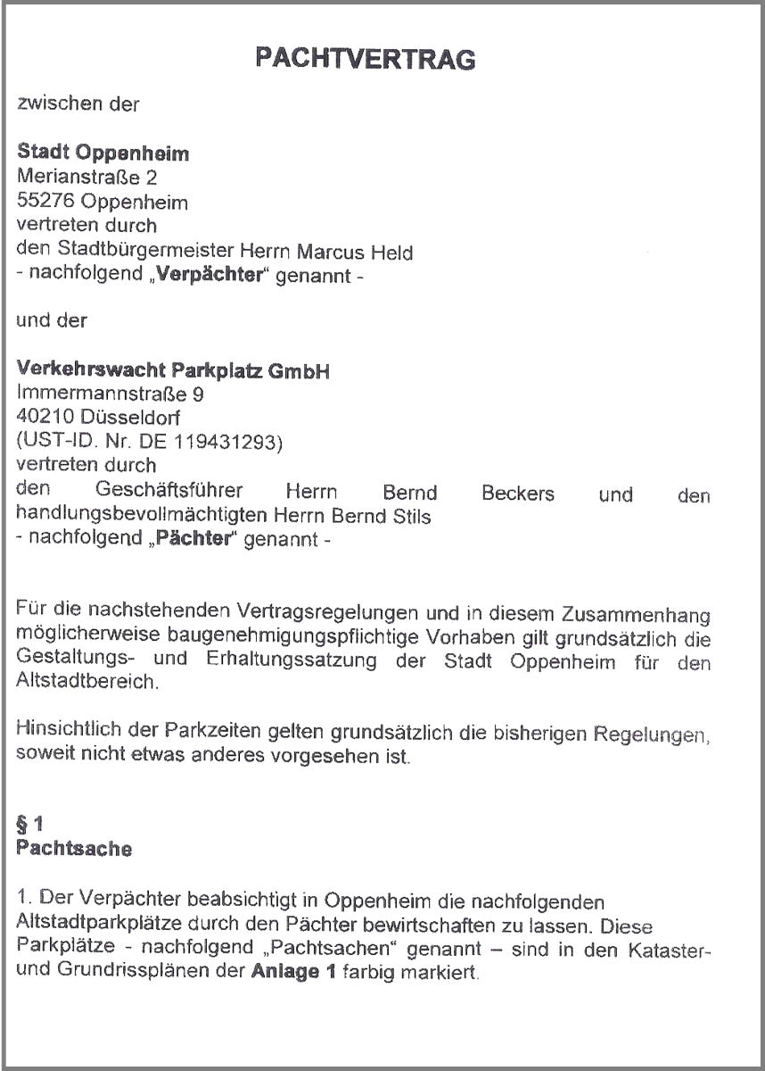 Dieser zweite Vertrag trägt die schlichte Überschrift „Pachtvertrag“: Damit überließ Stadtbürgermeister Held dem Düsseldorfer Unternehmen die städtischen Parkplätze in der Oppenheimer Innenstadt zur Bewirtschaftung: Dort darf die Verkehrswacht GmbH seither die gesamten Parkgebühren kassieren und einbehalten – und muss im Gegenzug nicht einen einzigen Cent an die Stadt zahlen: Die Investitionskosten für den Bau eines Parkplatzes, so heißt es im Vertrag freundlich-mitfühlend, stellten bereits eine hohe finanzielle Belastung für das Unternehmen dar.
